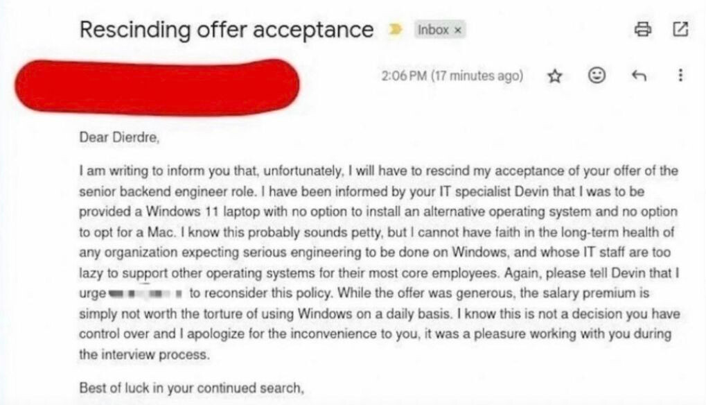 Er zijn voldoende mensen die een job zouden weigeren indien ze verplicht een mac zouden moeten gebruiken.